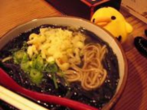 ○映画鑑賞の中休み、すぐ上の階のラーメンスタジアムで遅すぎる昼食にする。今回は前回と違うところにしようと、富山ブラック麺屋いろはで「白エビだし塩らーめん」にした。(キイロイトリとむすび丸が今日は買物に付き添ってきた) えびだしの風味がやはり…